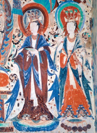 供养菩萨头戴三珠宝冠,两鬓作燕尾状,长披巾兼作袿衣之饰,垂襳髾,衣裳下部缀髾饰。一菩萨宽袖,穿笏头履;一菩萨直袖,穿高墙履。其服饰色彩艳丽,应来源于当时北朝贵族妇女的装束,与南朝妇女的飞襳垂髾式华服相比,其风格显得更加简约明快。