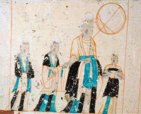 贵妇上着白色广袖对襟襦衫,下着黑绿间色长裙,腰间缀绿色髾饰,中垂襳褵,是典型的汉族贵妇装束。身后有三女侍,一执扇、一捧盒,一持巾,簇拥着贵妇前行。三女侍均头梳丫髻,穿上襦下间色裙,有围腰,但是没有飞襳垂髾的装饰;且贵妇襦长膝下,女侍襦长膝上,由此显示贵妇与奴婢的差别。