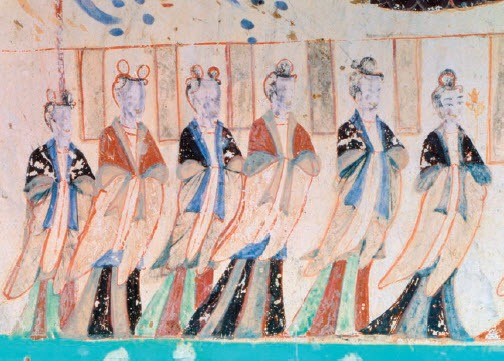 贵妇梳单丸髻和双丸髻,上襦中垂襳褵,披巾搭在肩上,下着各色间裙,是贵族妇女的常服。衣纹飘逸,体态修长,具有南朝风度。